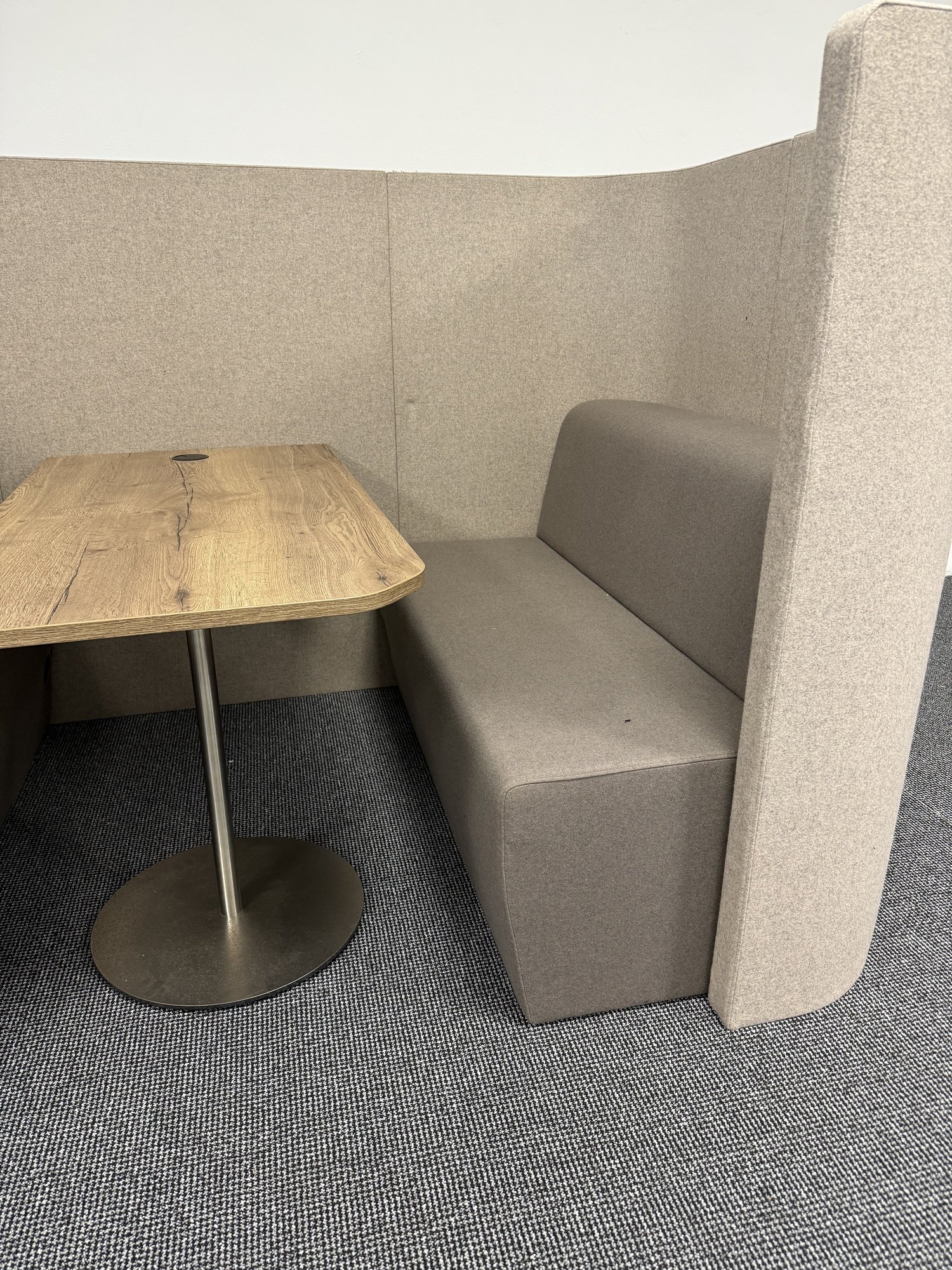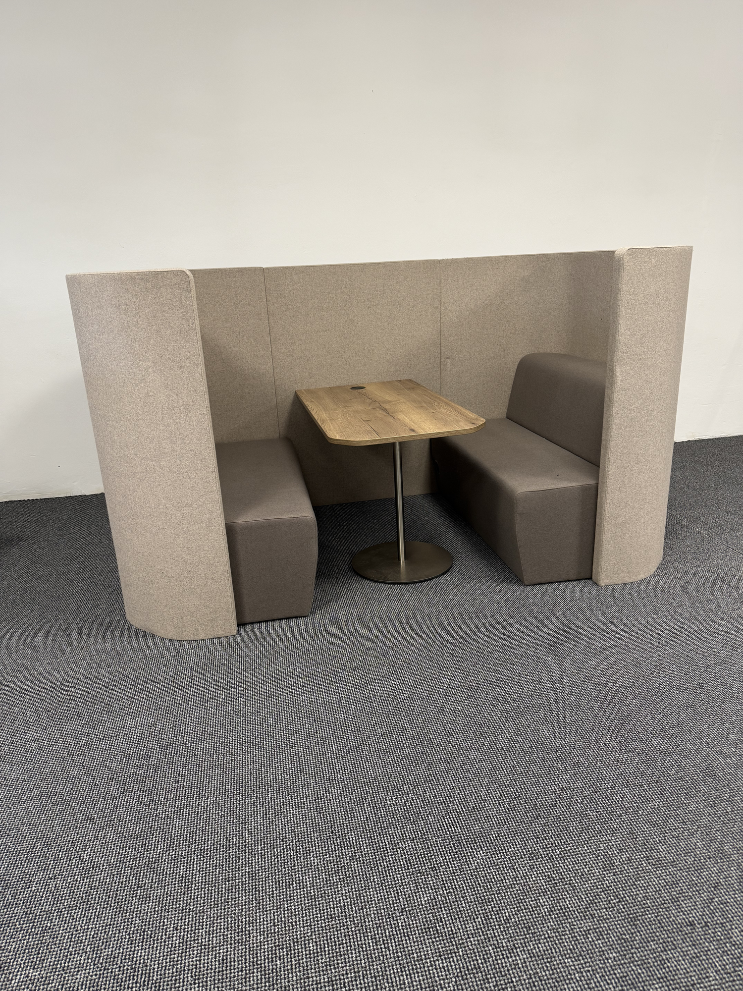 Akustische Sitzgruppe Syneo Soft Lounge von Assmann für Besprechungs- und Rückzugsbereiche / Hohe Rückwand für Abschirmung und Schallreduktion / Komfortable Polstersitze / Integrierter Tisch mit Holzplatte und Metallfuß / Ideal für Meetings im offenen Büro / Gebrauchtmöbel in gutem Zustand – hochwertige und nachhaltige Lösung für moderne Büroflächen