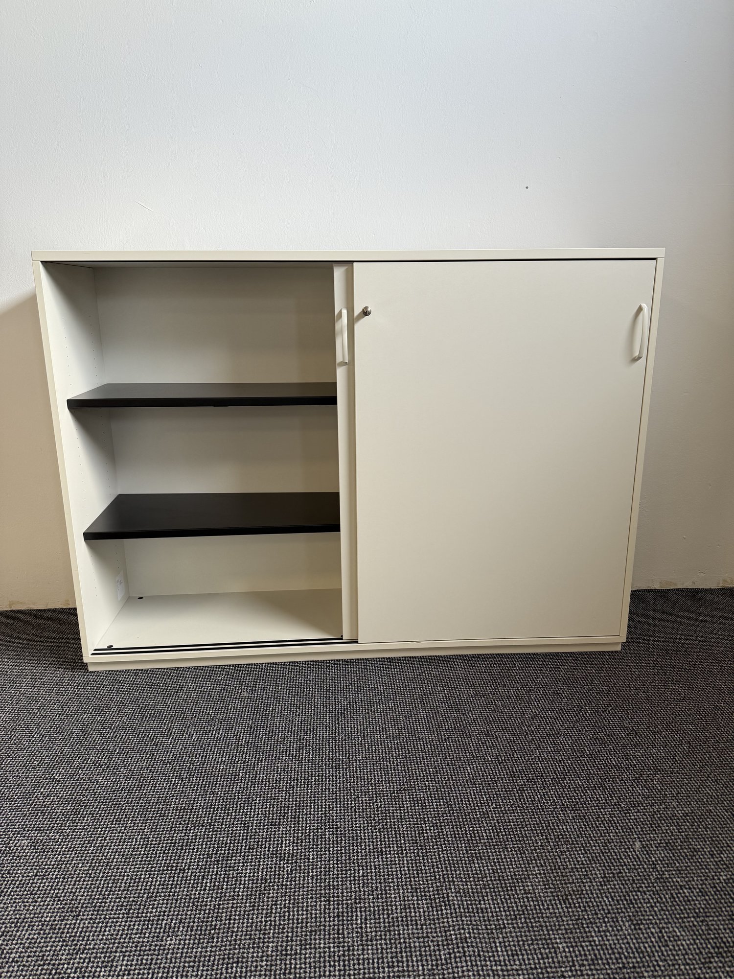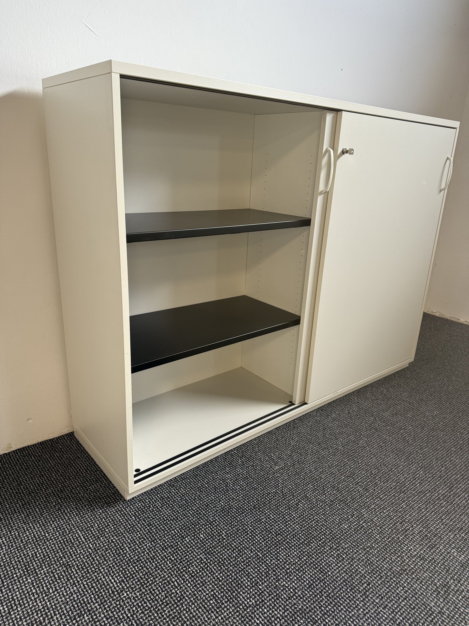 Dieser hochwertige Aktenschrank des Markenherstellers Kinnarps ist ein funktionales Stauraummöbel für professionelle Büro- und Arbeitsumgebungen. Er eignet sich ideal zur strukturierten Ablage von Akten, Ordnern und Unterlagen in Büros, Verwaltungen, Praxen oder Projektflächen. Durch die platzsparenden Schiebetüren ist der Schrank auch in schmaleren Räumen oder Verkehrsbereichen effizient einsetzbar. nn• Hersteller: Kinnarps n• Ausführung: Aktenschrank mit Schiebetüren n• Stauraum: 3 Ordnerhöhen n• Abschließbar zur sicheren Aufbewahrung n• Stabile Fachböden für den täglichen Büroeinsatz n• Farbe: Weiß n• Maße (B x T x H): ca. 160 x 44 x 118 cm nnDer Aktenschrank befindet sich in einem sehr guten gebrauchten Zustand und ist voll funktionsfähig. Als Gebrauchtmöbel stellt er eine wirtschaftliche und nachhaltige Lösung für Unternehmen dar, die Wert auf langlebige Markenqualität und professionelle Büroausstattung legen.