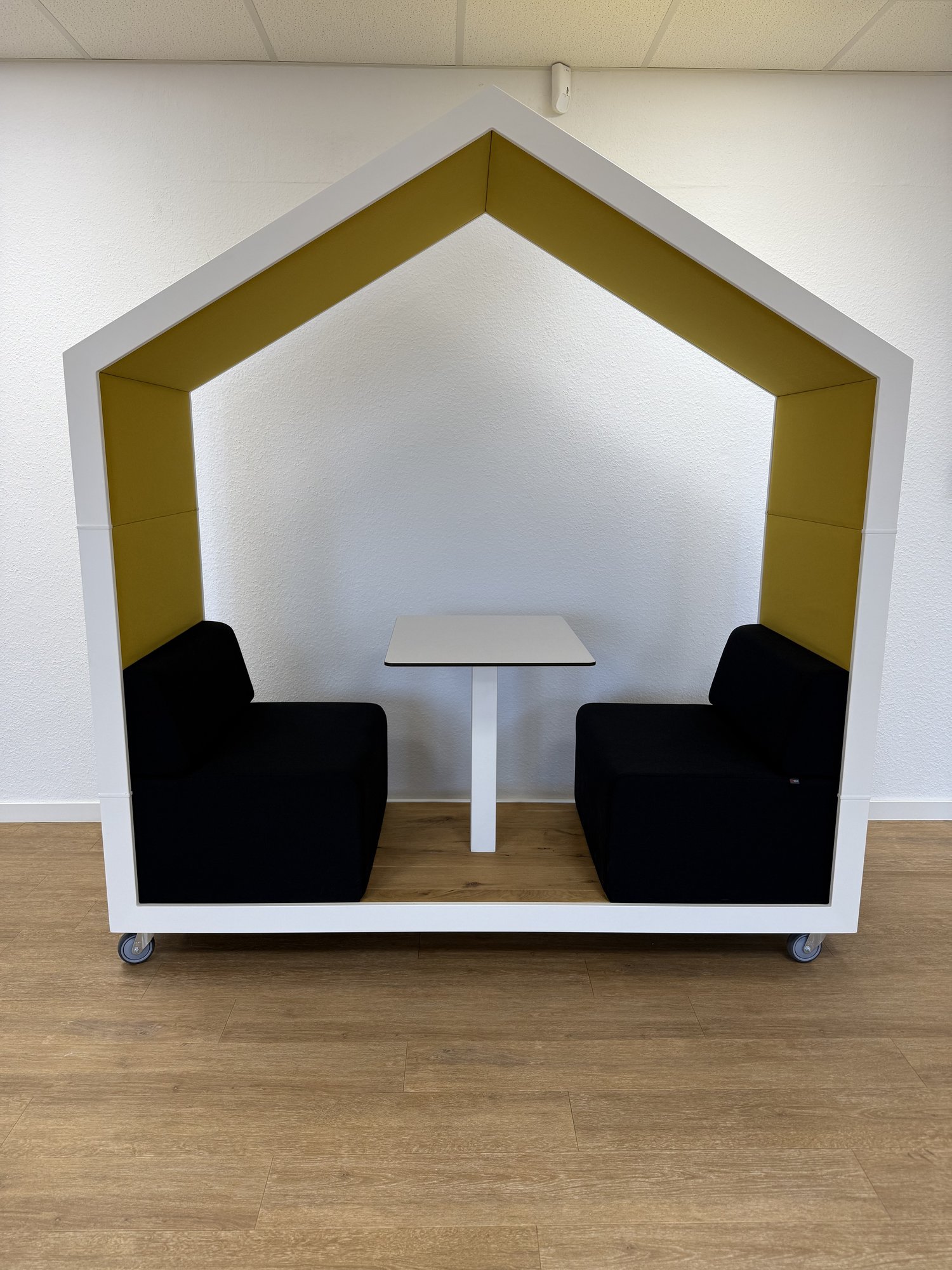 Mobiler Meetingpoint mit akustisch gepolsterten Innenwänden zur Strukturierung offener Büroflächen und Schaffung abgeschirmter Meeting- und Rückzugszonen | Hersteller Bejot | Modell Treehouse | Einsatz als Mittelzonenmöbel für Meetings Gespräche konzentriertes Arbeiten und temporäre Projektarbeit | Akustisch wirksame Innenwände | Überdachung für visuelle und akustische Abschirmung | Zwei integrierte Sitzplätze | Feste Tischfläche im Innenraum | Vier Rollen davon zwei feststellbar | Maße ca 210 x 78 x 230 cm | Professionelle Büroqualität | Gebrauchtmöbel in sehr gepflegtem funktionsfähigem Zustand