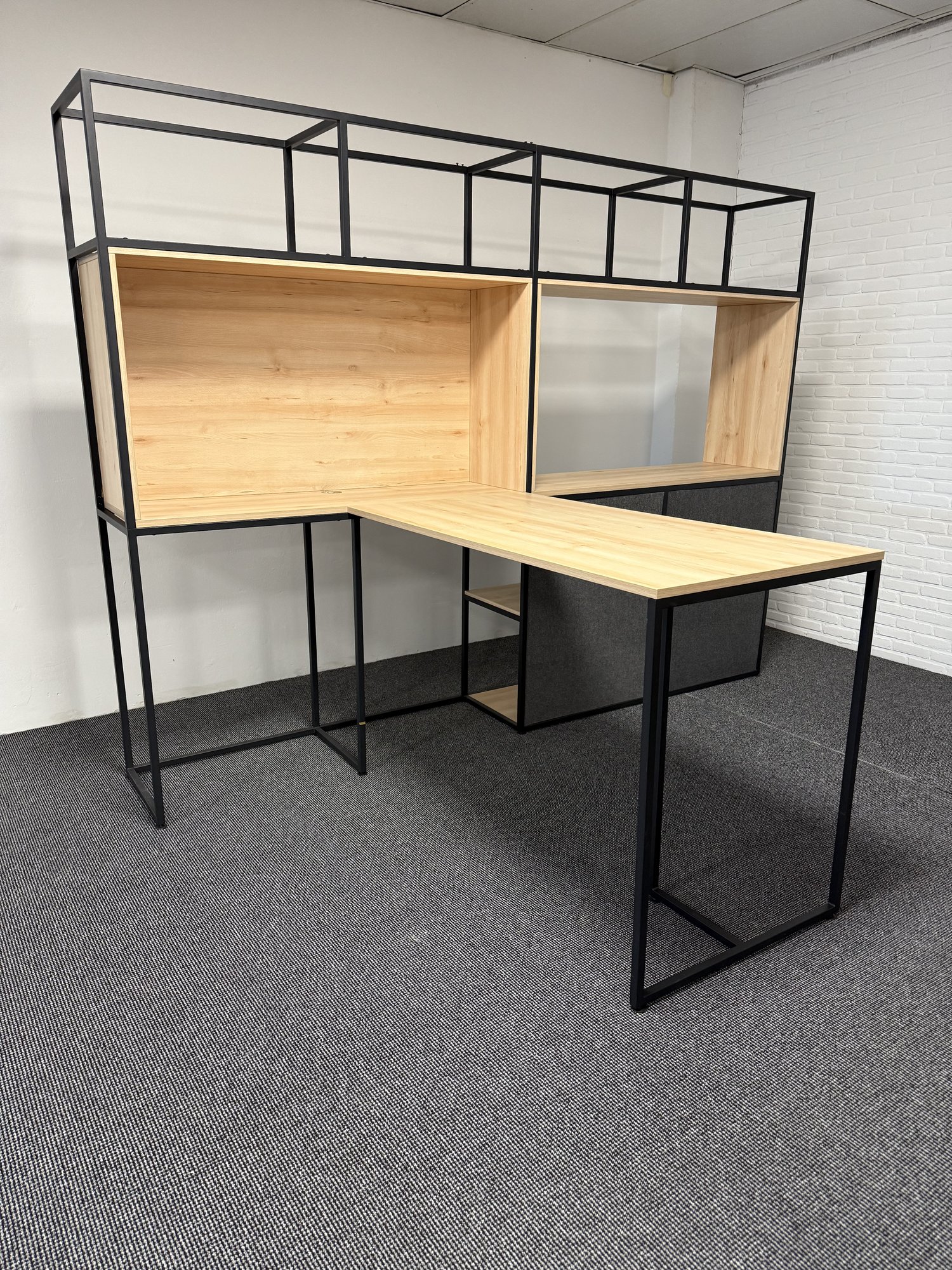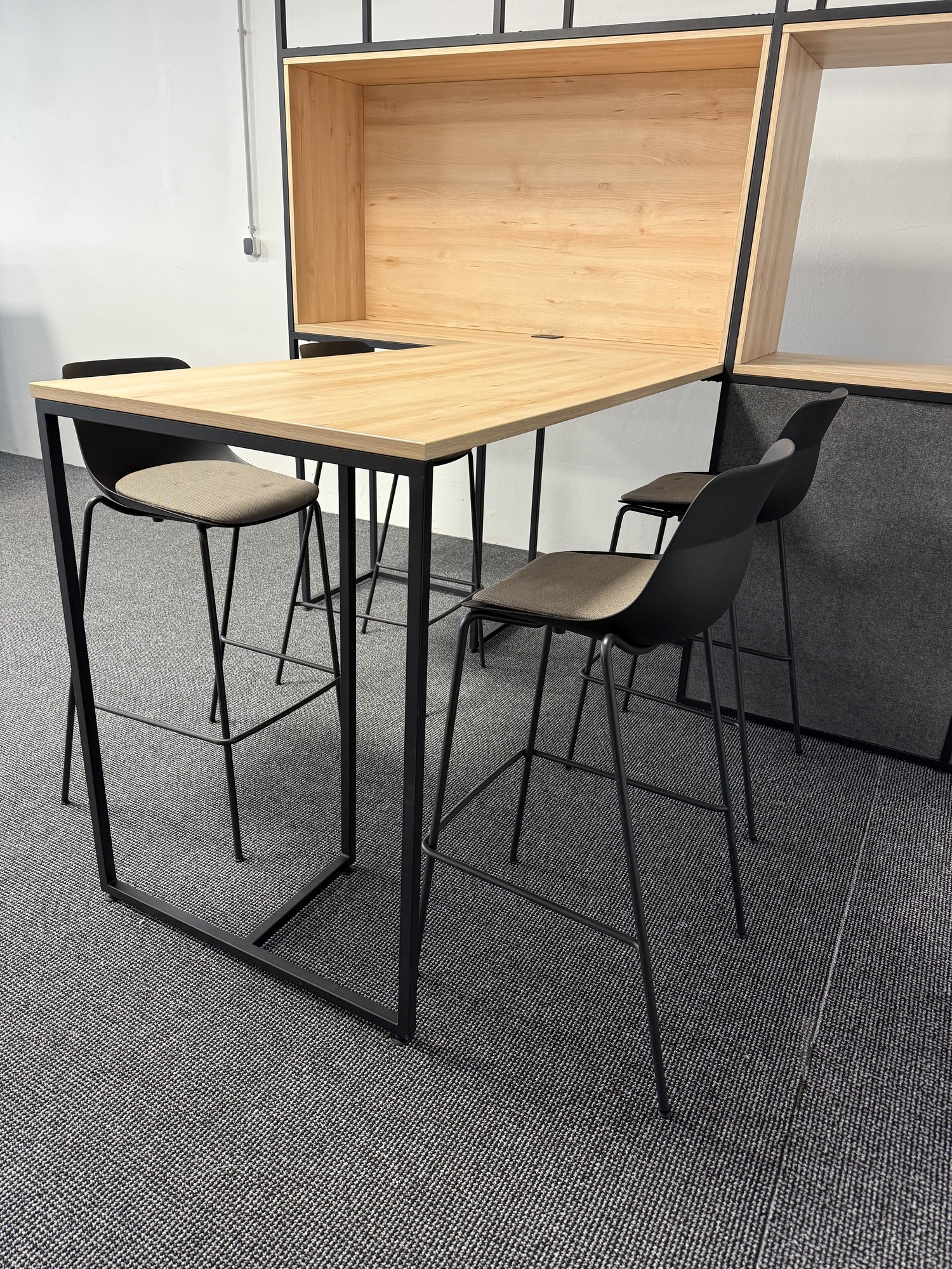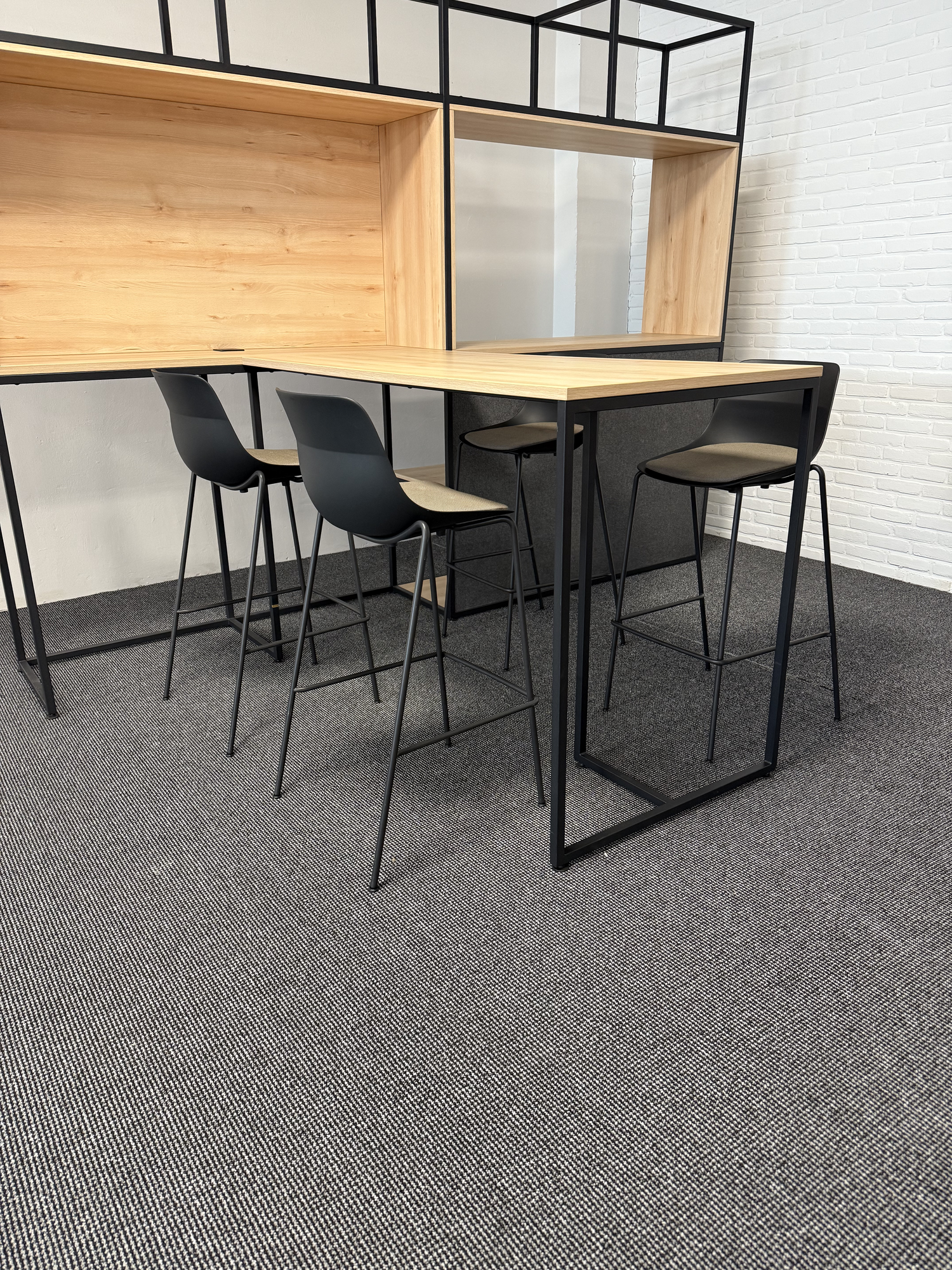 Dieses Design-Büromöbel-Set von Nowy Styl besteht aus einer großformatigen Regalwand und einem passenden Hochtisch und eignet sich ideal für moderne Büroflächen, Empfangsbereiche, Kommunikationszonen oder informelle Besprechungsbereiche. Die Kombination aus schwarzem Metallgestell und heller Holzoptik verleiht dem Set eine klare, zeitgemäße Gestaltung und schafft eine professionelle Atmosphäre im Büro. Der Hochtisch eignet sich für Meetings im Stehen, kurze Abstimmungen oder als Kommunikationspunkt, während die Regalwand Stauraum und Struktur für Arbeits- oder Präsentationsflächen bietet. • Hersteller: Nowy Styl • Möbeltyp: Regalwand mit Hochtisch • Set bestehend aus Regalwand und Hochtisch • Regalwand: ca. 310 × 50 × 232 cm (Breite × Tiefe × Höhe) • Hochtisch: ca. 160 × 80 × 110 cm (Breite × Tiefe × Höhe) • Metallgestell in schwarzer Ausführung • Oberflächen in heller Holzoptik • Klare, offene Konstruktion für moderne Bürokonzepte. Das Set stammt aus professioneller Nutzung und befindet sich in sehr gutem gebrauchten Zustand. Es ist hochwertig verarbeitet, voll einsatzbereit und bietet als gebrauchtes Markenmöbel eine wirtschaftliche und nachhaltige Lösung für Unternehmen, die moderne und repräsentative Bürobereiche gestalten möchten.
