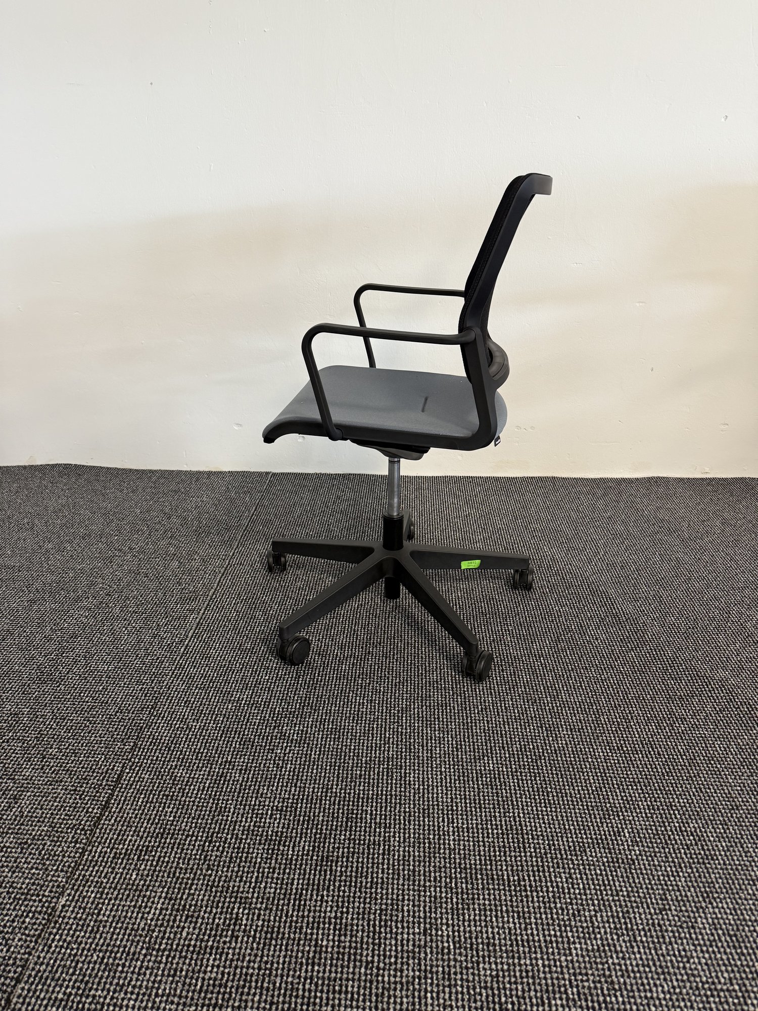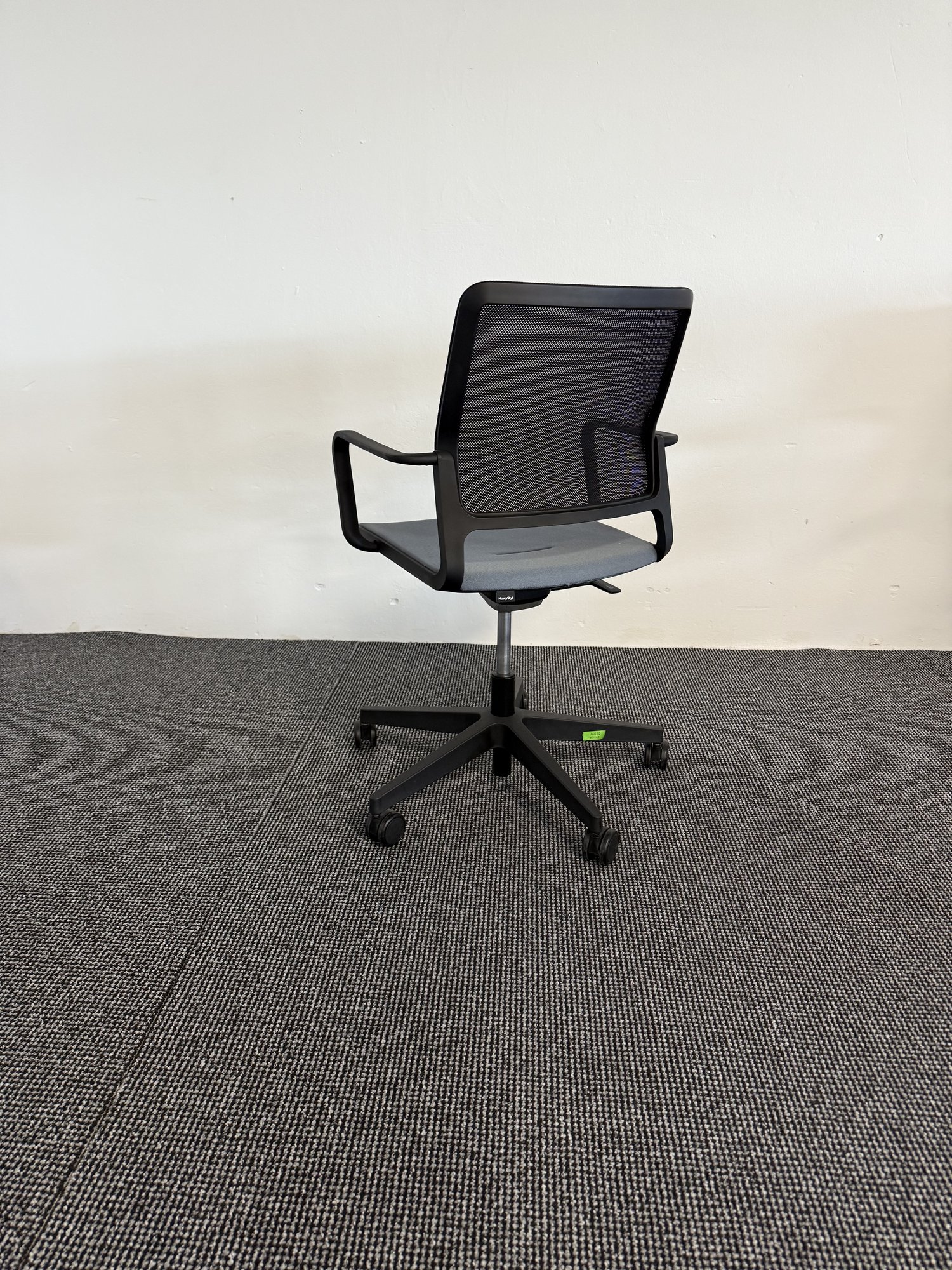 Konferenz-Drehstuhl aus der Xilium-Serie von Nowy Styl für moderne Besprechungs- und Arbeitsbereiche / Geeignet für Konferenzräume, Projektzonen und flexible Arbeitsplätze / Unterstützt aktives Sitzen bei schlankem, zeitgemäßem Design / Netzrücken für angenehme Belüftung / Gepolsterte Sitzfläche / Tilt-Mechanik / Sitzhöhenverstellung ca. 38–51 cm / Fixe Armlehnen / Gebrauchtmöbel in gepflegtem Zustand – ressourcenschonende Lösung für professionelle Büroausstattung