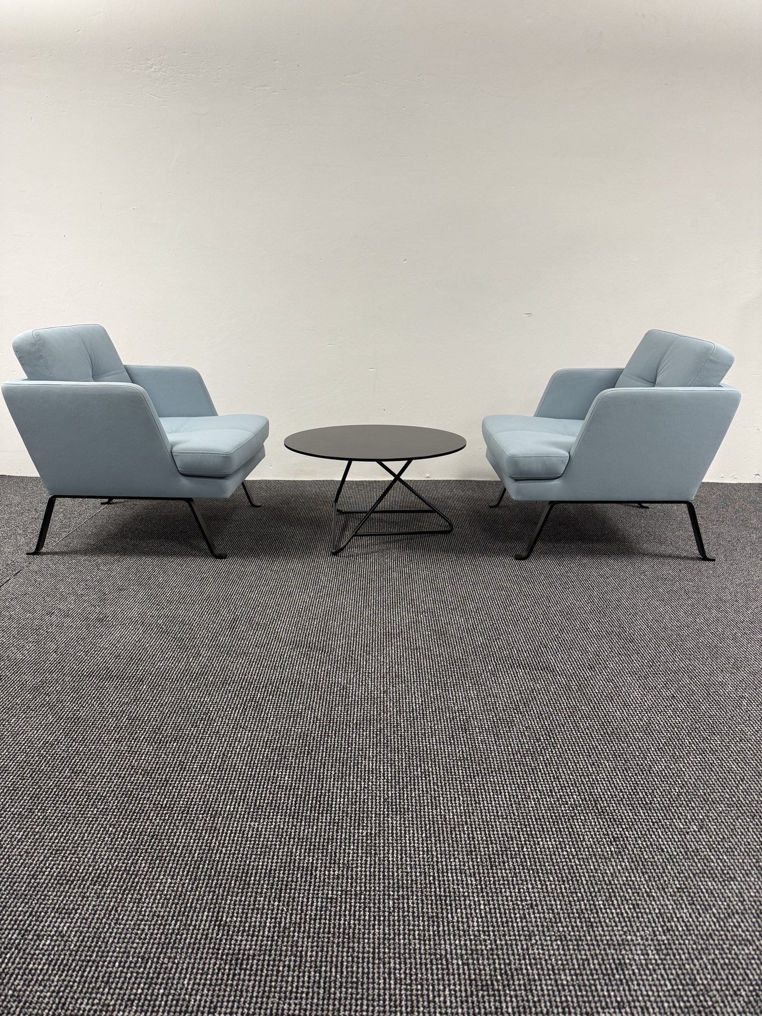 Hochwertiger Loungesessel aus der Serie October 11 von Profim für Empfangsbereiche, Lounges, Wartezonen und Besprechungsinseln; kompakte Bauweise mit Armlehnen ermöglicht hohen Sitzkomfort bei geringem Platzbedarf; geeignet für den professionellen Objekt- und Büroeinsatz; Hersteller Profim; Modell October 11 Loungesessel; Maße ca. 80 × 75 × 75 cm (B × T × H); Farbe Hellblau; Bezug Stoff; Gestell Metall in Schwarz; stabile Verarbeitung für den täglichen Einsatz; Zustand gebraucht, sehr gepflegt und geprüft; ressourcenschonende Wiederverwendung