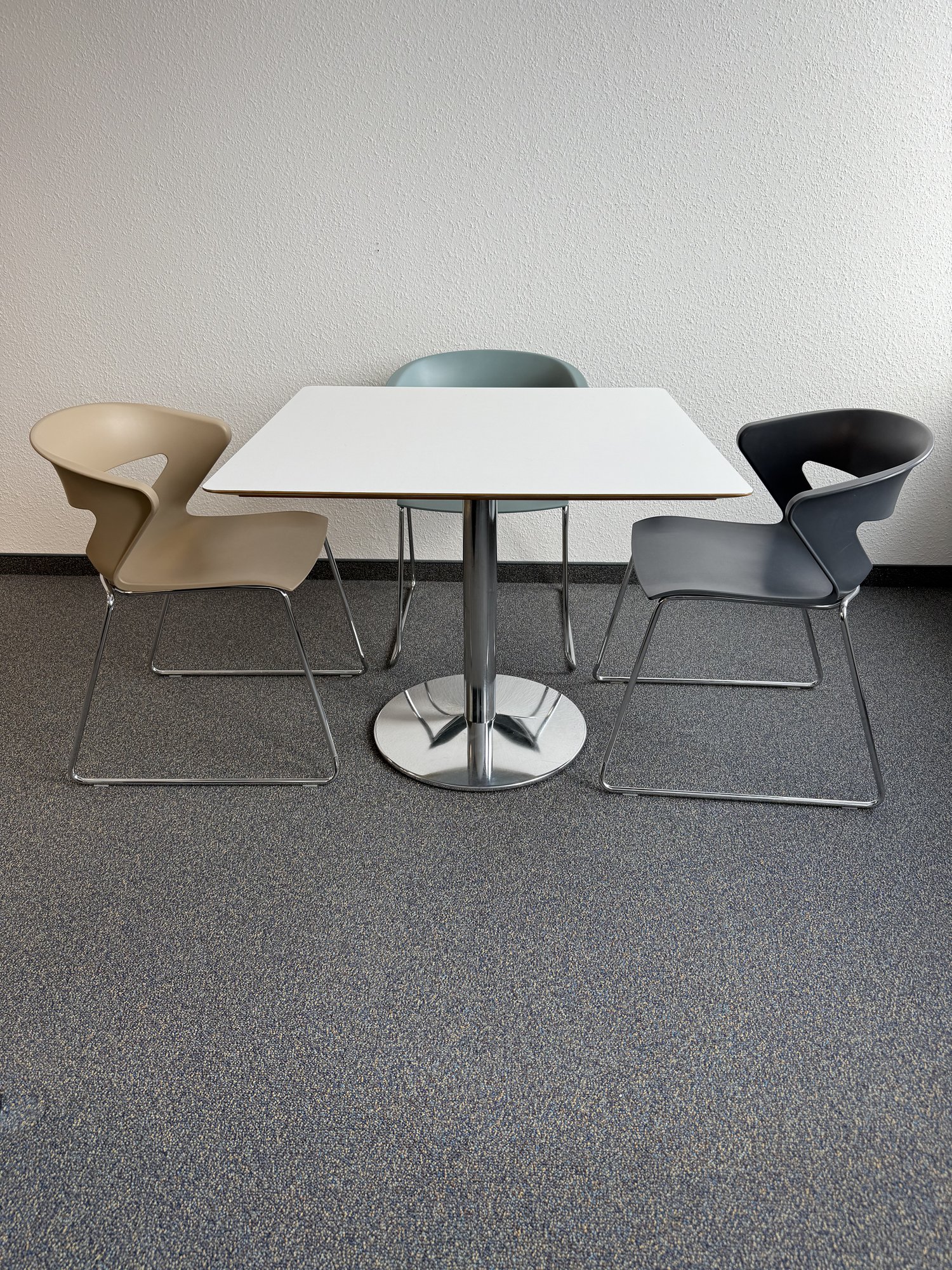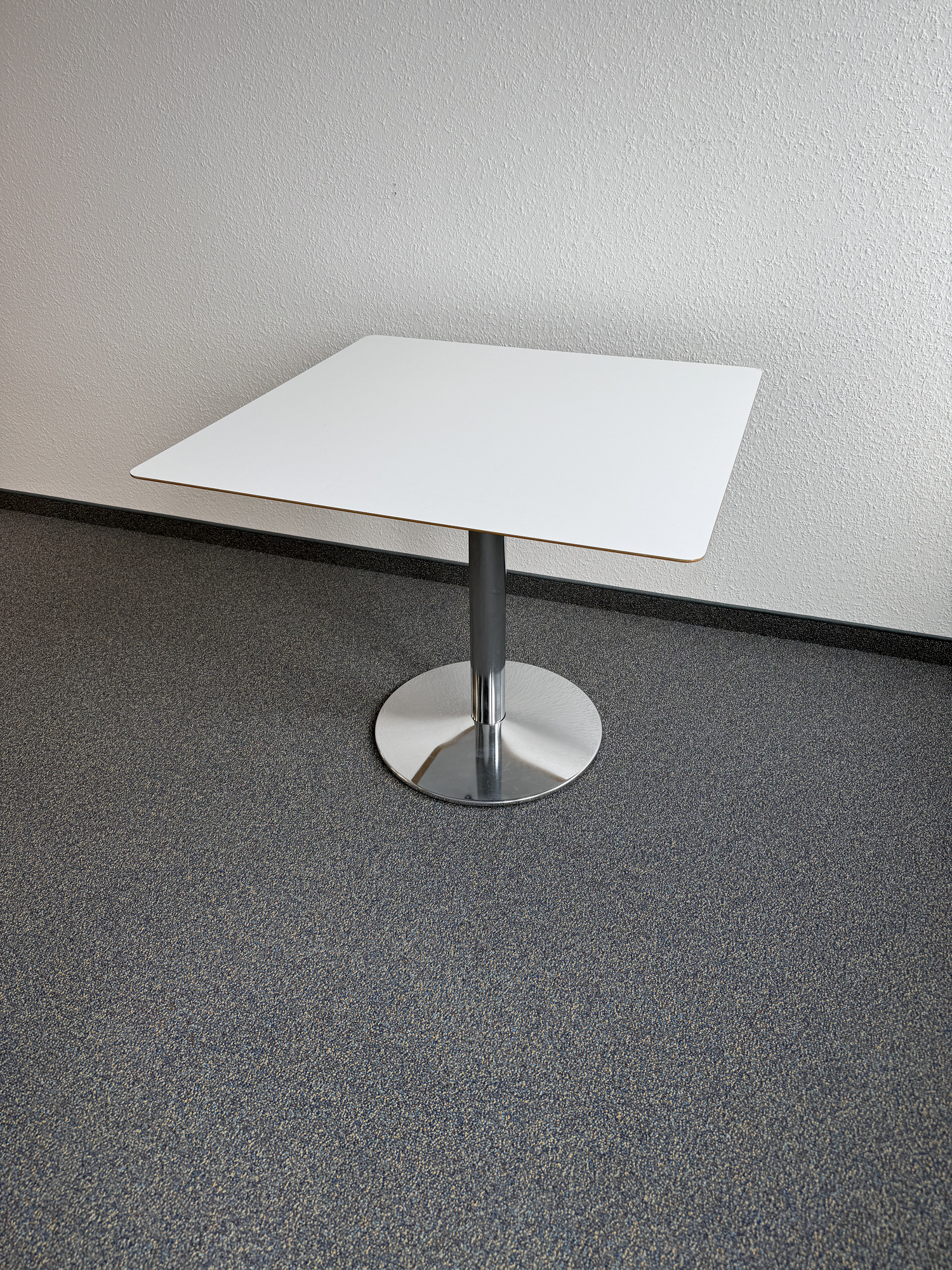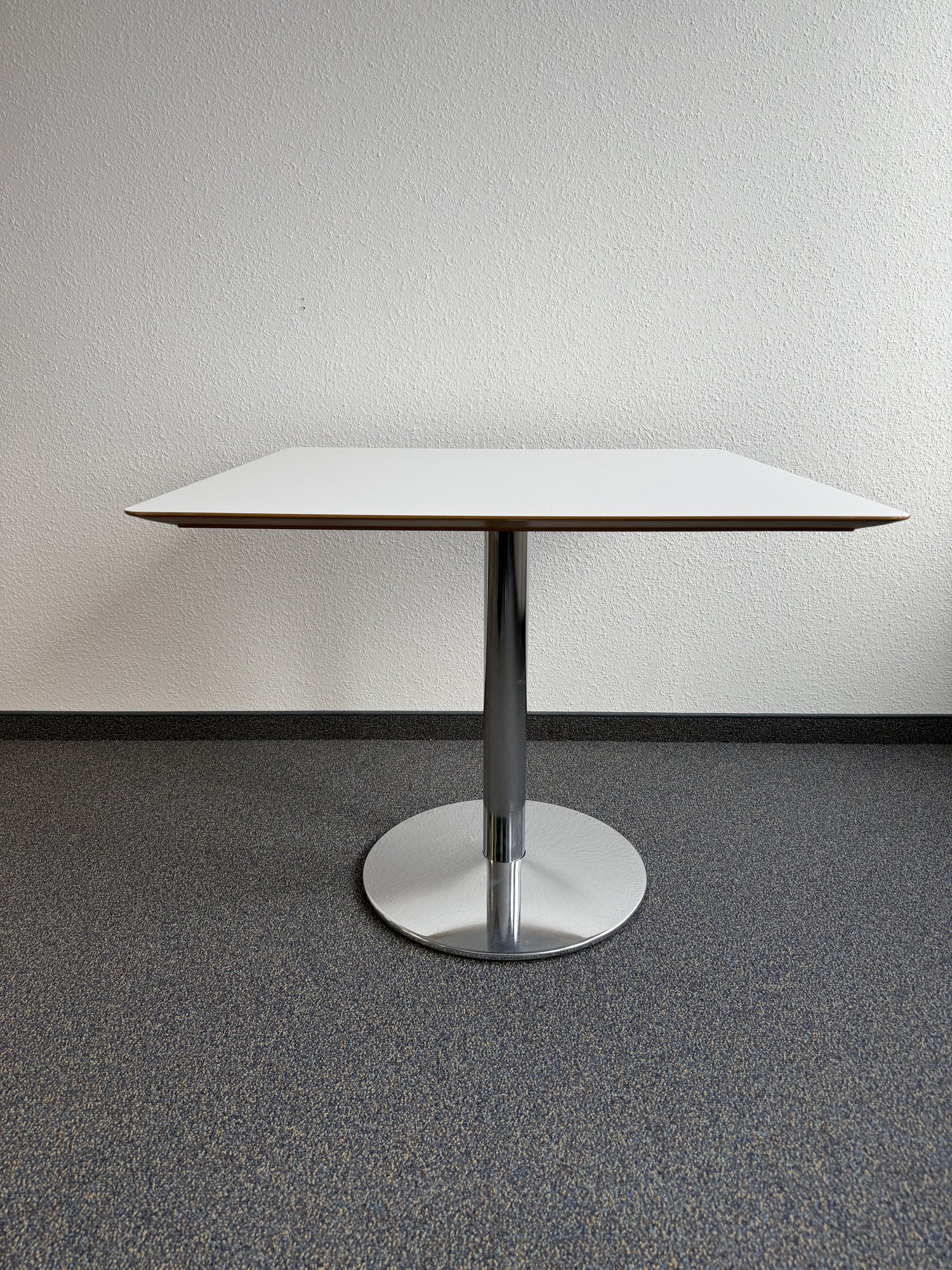 Quadratischer Bistrotisch mit stabiler Tischplatte und zentralem Säulenfuß aus Metall bzw. Aluminium. Ideal für Pausenbereiche, Bistrozonen, Cafeterien, Kommunikationsflächen oder informelle Besprechungen im Büro. Die großzügige Tischfläche bietet Platz für mehrere Personen und eignet sich auch als kompakter Besprechungs- oder Projekttisch. • Quadratische Tischplatte ca. 90 x 90 cm • Robuster Säulenfuß aus Metall/Aluminium • Standfeste Konstruktion mit runder Bodenplatte • Pflegeleichte, neutrale Oberfläche • Vielseitig einsetzbar in Büro-, Lounge- oder Gastrobereichen • Zustand: gebraucht, gepflegt, voll funktionsfähig – nachhaltige Wiederverwendung hochwertiger Objektmöbel