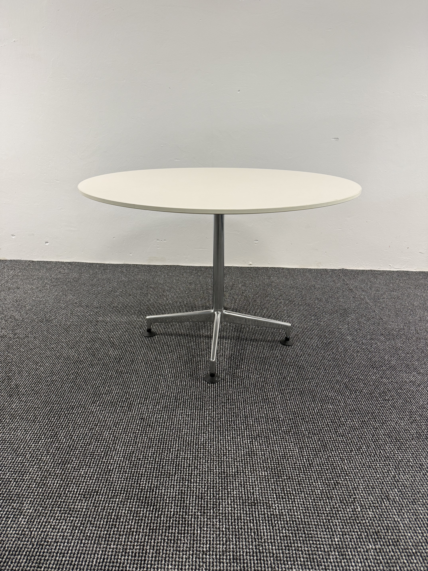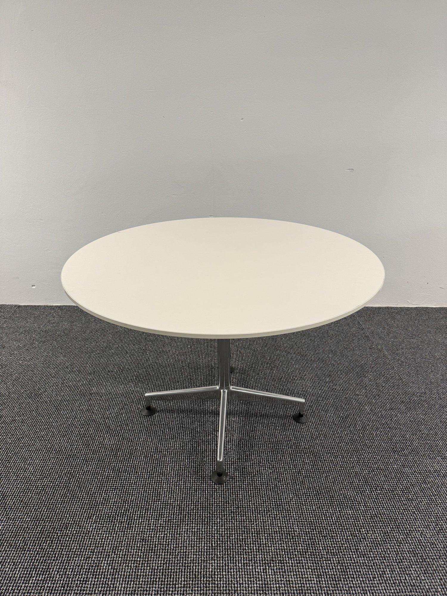 Runder Tisch für Besprechungs-, Aufenthalts- und Loungezonen in Büro- und Projektumgebungen, geeignet für kurze Meetings, Teamrunden oder Aufenthaltsbereiche; neutrales Design zur flexiblen Integration in bestehende Raumkonzepte; Merkmale: runde Tischplatte ca. Ø 110 cm, stabiles Metallgestell mit zentraler Säule, standfester Fuß, pflegeleichte Oberfläche in heller Ausführung; Zustand: gebraucht aus gewerblichem Einsatz, gepflegt und voll funktionsfähig, wirtschaftliche und nachhaltige Einrichtungslösung