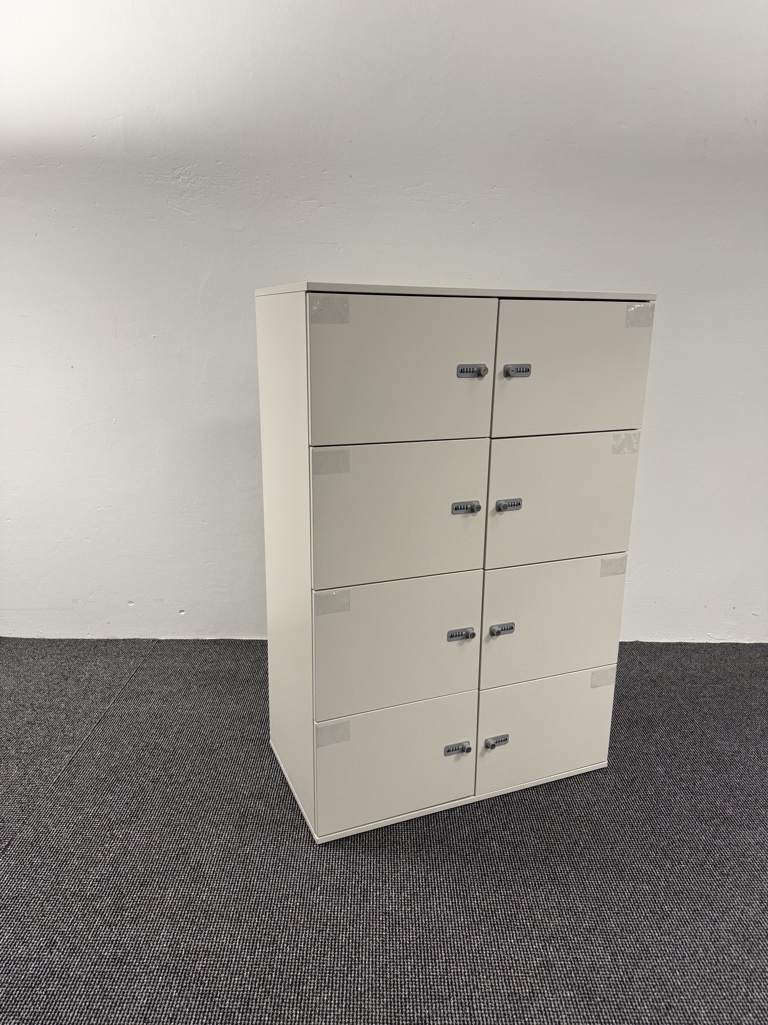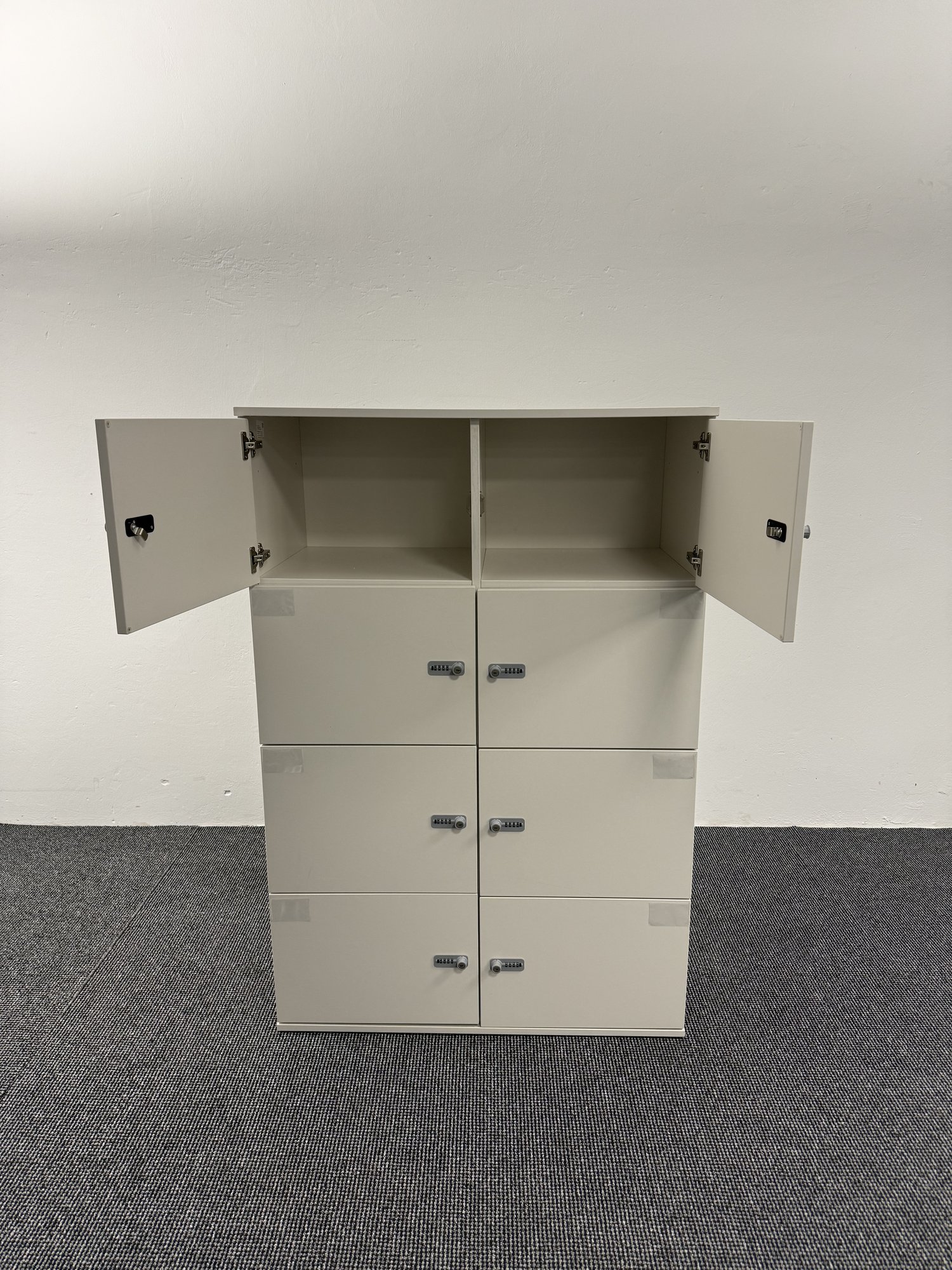 Dieser Schließfachschrank in weißer Ausführung ist eine praktische und sichere Aufbewahrungslösung für professionelle Büroumgebungen. Er eignet sich ideal für Büros, Coworking-Spaces, Sozialräume, Umkleidebereiche oder Gemeinschaftszonen, in denen persönliche Gegenstände sicher verstaut werden sollen. Die einzelnen Fächer sind jeweils mit einem Zahlenschloss ausgestattet und ermöglichen eine nutzerunabhängige, flexible Nutzung ohne Schlüsselverwaltung. • Schließfachschrank mit mehreren Fächern • Maße ca. 100 × 53 × 150 cm (Breite × Tiefe × Höhe) • Farbgebung: Weiß • Ausstattung mit integrierten Zahlenschlössern • Mehrere separat nutzbare Fächer • Stabile, langlebige Bauweise für den täglichen Einsatz im Objektbereich. Der Schrank stammt aus professioneller Nutzung und befindet sich in sehr gutem gebrauchten Zustand. Er ist voll funktionsfähig und sofort einsatzbereit. Als gebrauchtes Büromöbel stellt er eine wirtschaftliche und nachhaltige Lösung für Unternehmen dar, die Wert auf Ordnung, Sicherheit und effiziente Raumnutzung legen.
