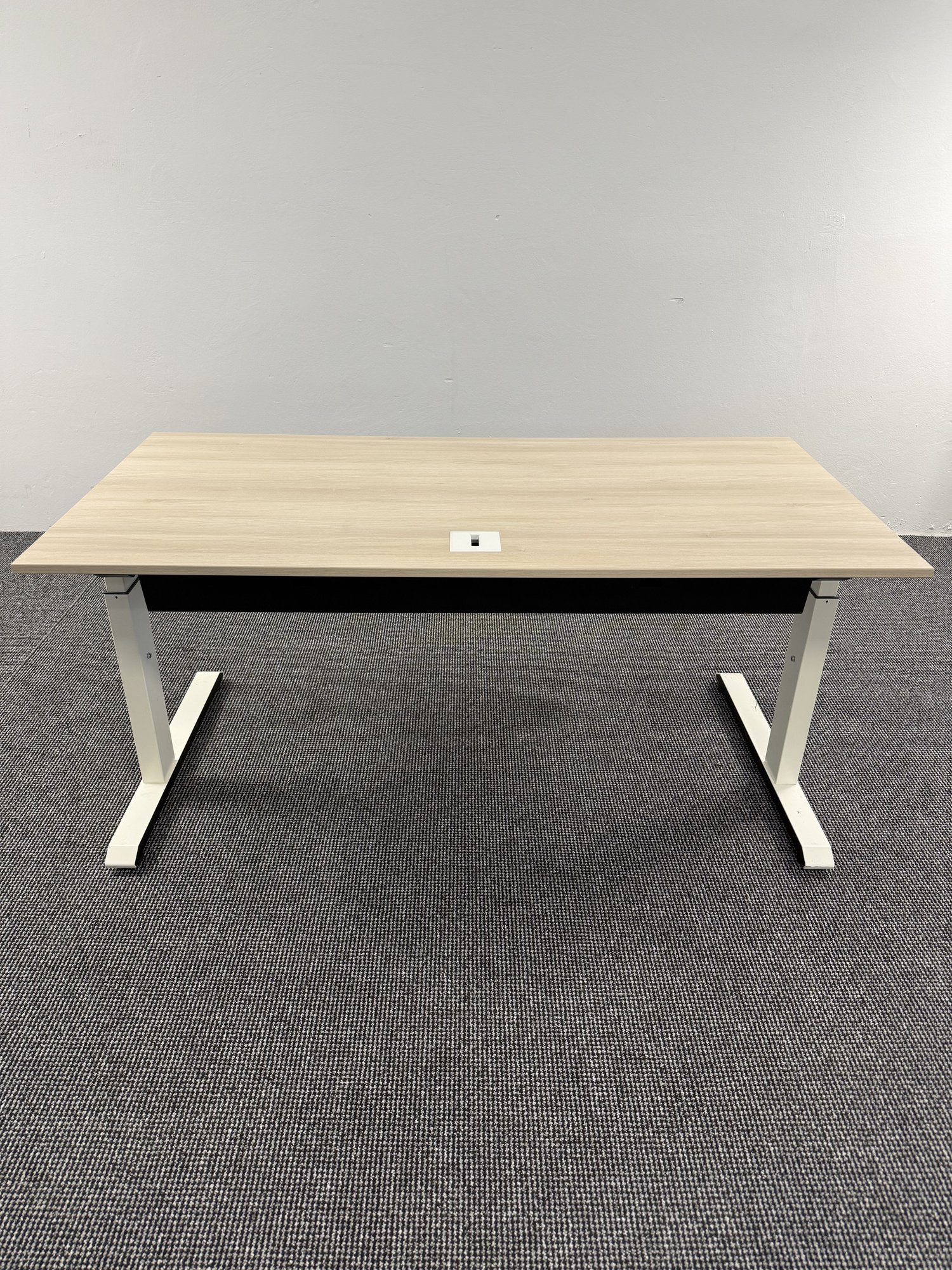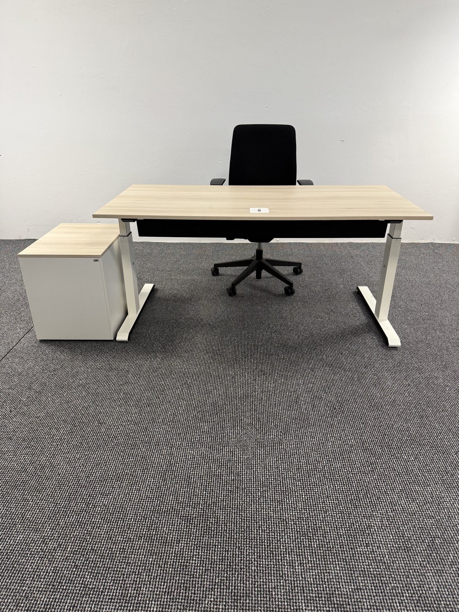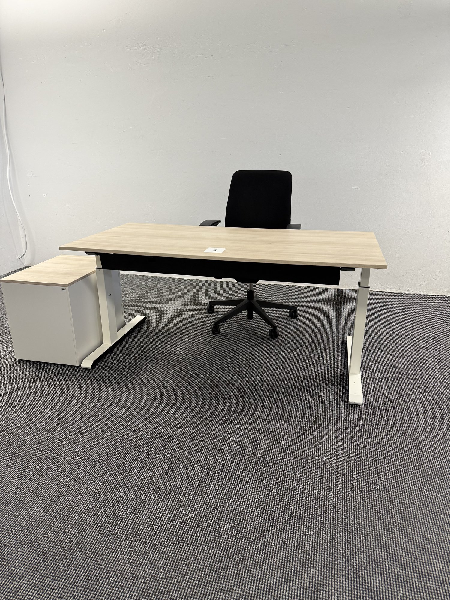 Gebrauchter professioneller Büroschreibtisch aus dem Sedus Temptation C Programm für den Einsatz in Einzelbüros, Open-Space-Flächen oder Projektumgebungen; der Tisch bietet eine ergonomische Arbeitsfläche und eignet sich für standardisierte Arbeitsplatzkonzepte in Unternehmen; Hersteller: Sedus | Modell: Temptation C | Tischform: Rechteck | Maße B x T x H: ca. 160 x 80 x 62–82 cm | Höhenverstellung: manuell | Gestell: C-Fuß-Gestell | Gestellfarbe: Weiß | Plattendekor: Akazie | Ausstattung: integrierter Kabelkanal | Zustand: gebraucht, sehr guter gepflegter Zustand aus professioneller Nutzung, technisch voll funktionsfähig; Wiederverwendung als wirtschaftliche und nachhaltige Lösung für moderne Büroeinrichtungen